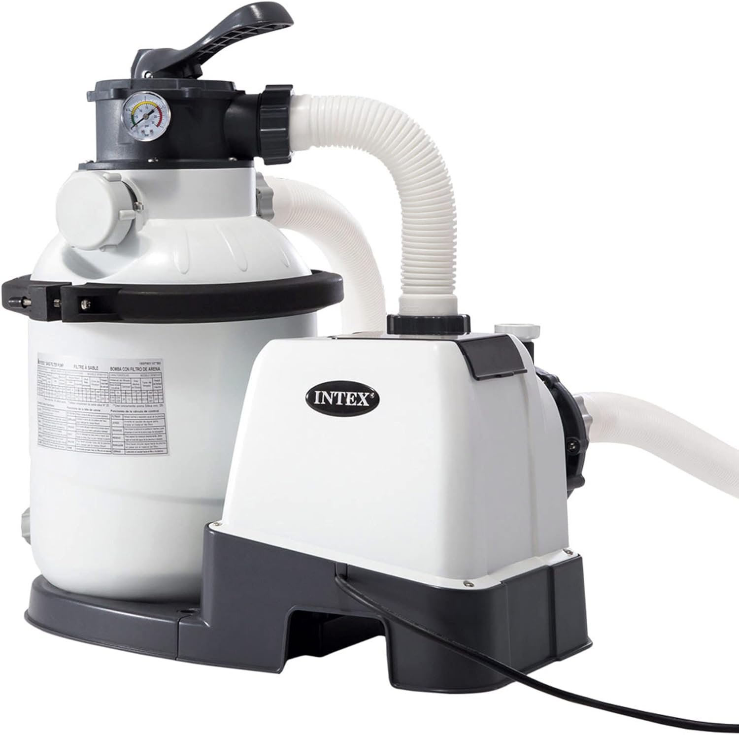 Incluye depuradora de arena con capacidad de filtración de 5.700 l/h y conexión de 38 mm (arena no incluida), escalera de seguridad, tapiz y cobertor