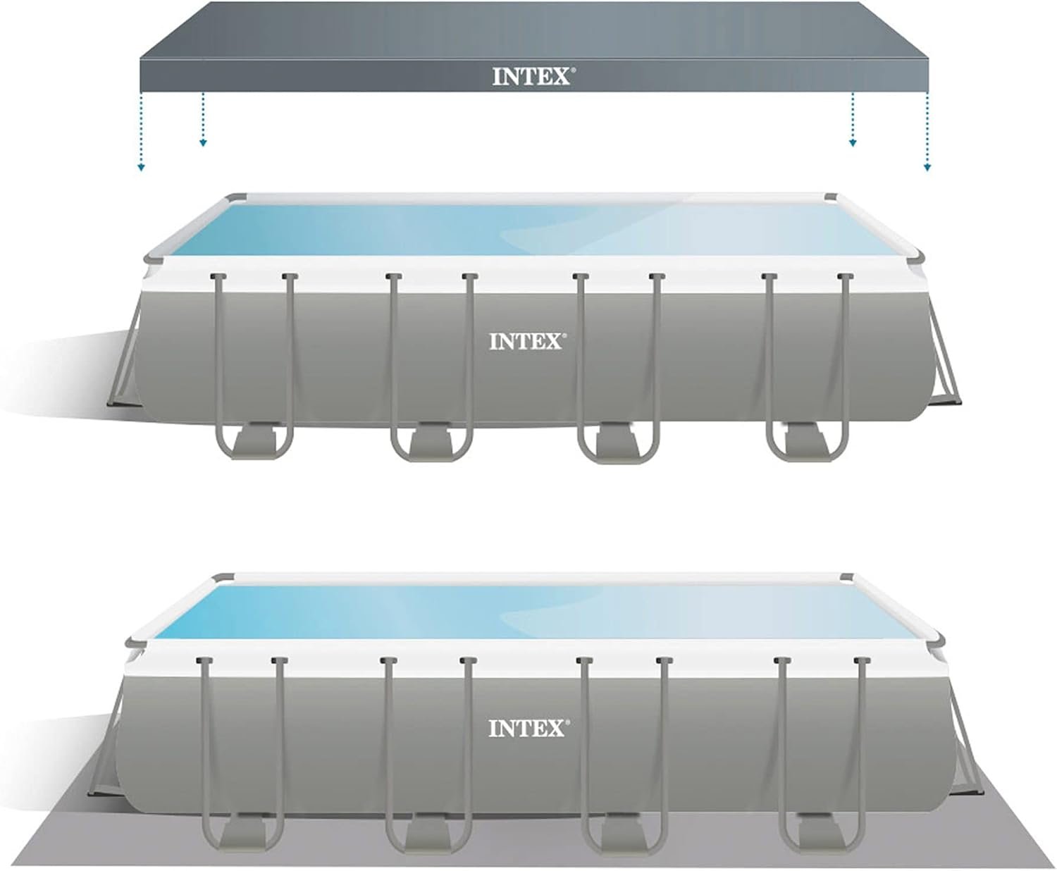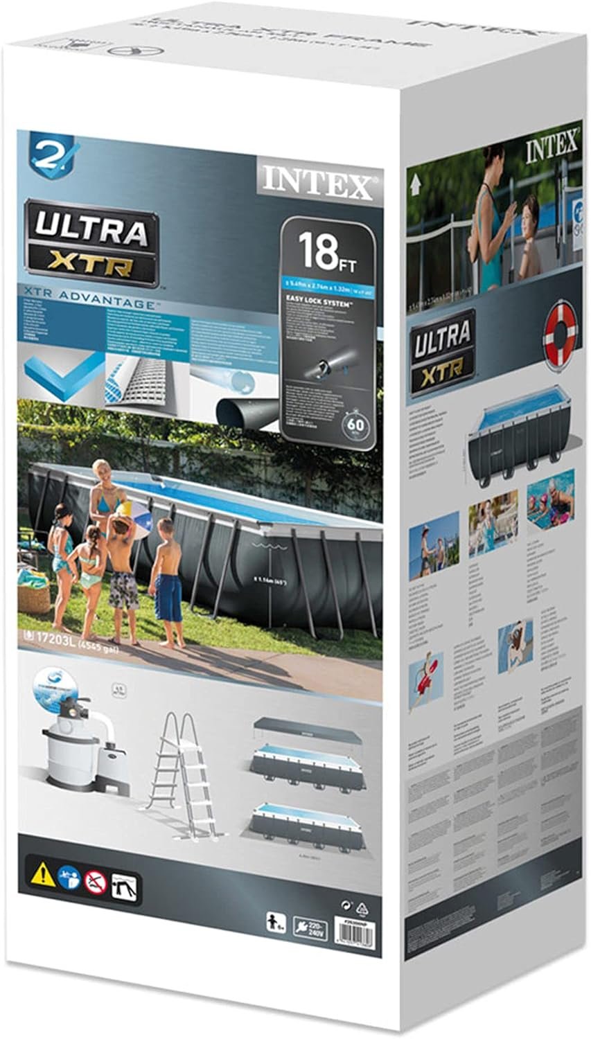 Piscina elevada rectangular gama Ultra XTR Frame INTEX, las medidas de la piscina son 549x274x132 cm y su capacidad es de 17.203 litros